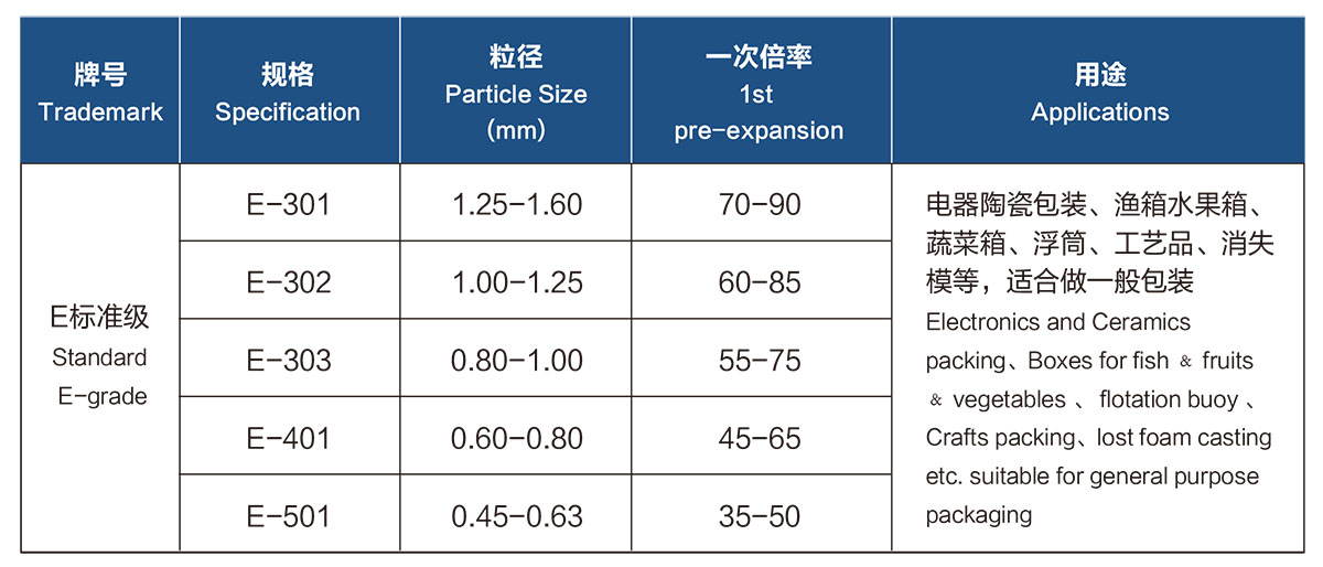 E-標準料是廣泛應用的普通型EPS,適用于自動真空成型機、傳統(tǒng)升降式液壓機。屬標準發(fā)泡倍率原料,可一次發(fā)泡達到較輕克重泡粒,也可多次發(fā)泡獲得更輕的泡塑制品,一般較適宜應用于一次發(fā)泡13克/升以上的制品,廣泛適用于機電產(chǎn)品包裝,土木建筑用保溫隔熱材料,漁用浮球筒,工藝品,裝飾裝潢建材,鑄件消失模等。